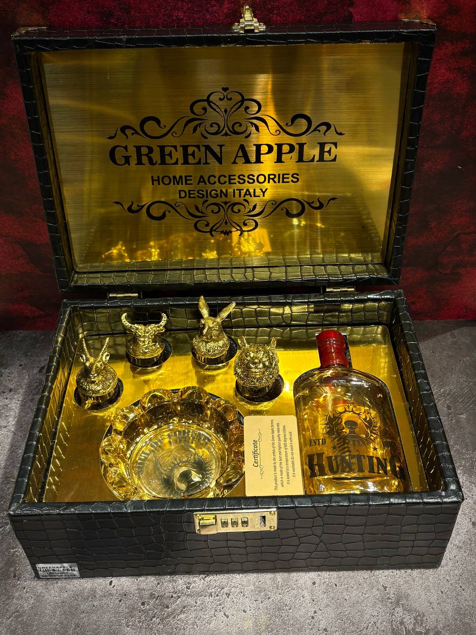 ست شات باکسی گرین اپل شامل چهار شات، زیرسیگاری بزرگ، بطری و باکس چرمی است. ظاهری جذاب، مناسب هدیه و استفاده در مهمانی‌ها.